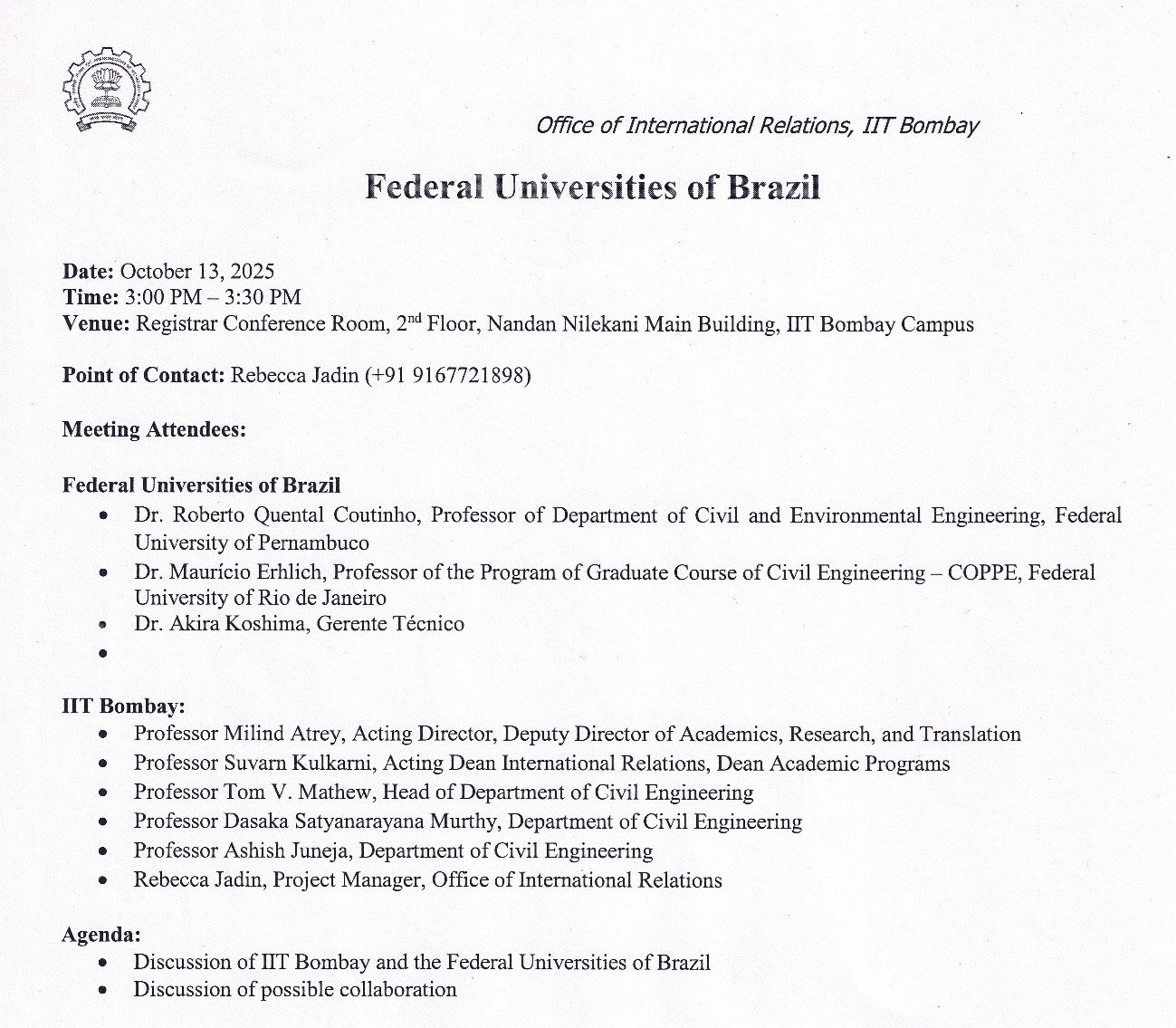 Ao final da visita, a comitiva participou de uma reunião oficial com a direção do IIT-Bombay, na qual foram apresentados planos e propostas de cooperação acadêmica e desenvolvimento conjunto de projetos técnicos e científicos, visando ao fortalecimento das relações entre Brasil e Índia no campo da Engenharia Geotécnica.