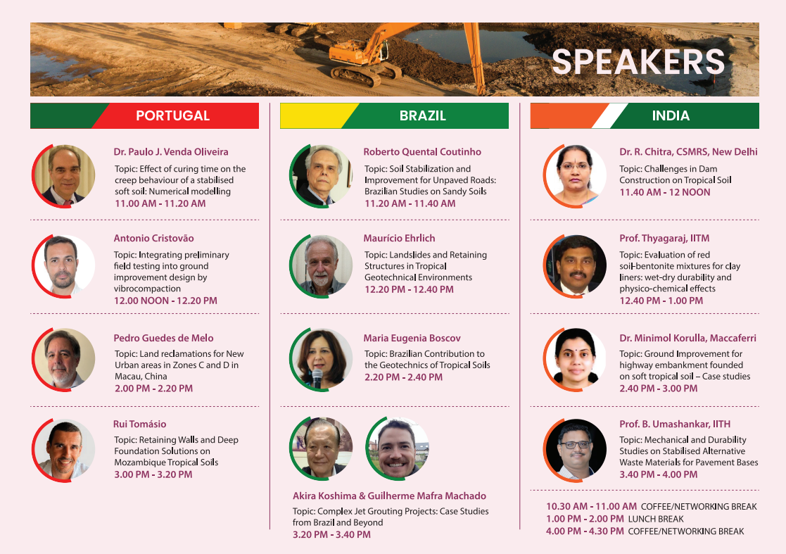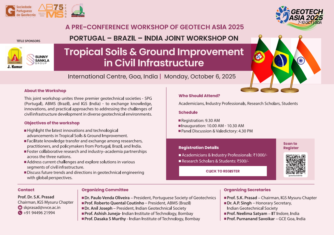 O workshop foi uma iniciativa conjunta da Indian Geotechnical Society (IGS), da Associação Brasileira de Mecânica dos Solos e Engenharia Geotécnica (ABMS) e da Sociedade Portuguesa de Geotecnia (SPG). Reuniu pesquisadores, profissionais e acadêmicos para discutir desafios e avanços na infraestrutura civil em ambientes geotécnicos diversos, com destaque para solos tropicais e técnicas de melhoria de solo.
