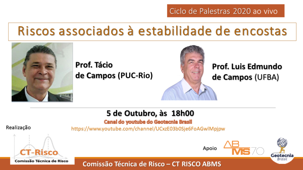 A Comissão Técnica de Riscos da ABMS realizará no próximo dia 5/10, às 18h, a palestra "Riscos associados à estabilidade de encostas". A apresentação conta com a participação dos engenheiros Tácio de Campos e Luis Edmundo de Campos. A palestra conta com o apoio da ABMS e do Grupo Geotecnia Brasil e será transmitida ao vivo no canal do Youtube do Geotecnia Brasil.