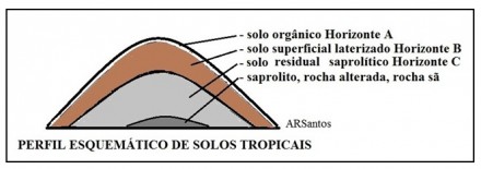 Em nosso ambiente climático tropical e sub-tropical, à exceção de relevos serranos e ambientes áridos, os solos alcançam grande profundidade, normalmente na ordem de dezenas de metros. Os geólogos de engenharia e os agrônomos usam termos diferentes para classificar os diferentes estratos de solos. Os primeiros adotam a seguinte série para o que denominam de camadas: solo orgânico (camada superficial dessimétrica rica em matéria orgânica); solo superficial, solo laterizado ou solo residual maduro (camada bastante afetada pelo intemperismo e pelos processos de laterização e pedogênese, cuja espessura varia de 0,5 m a alguns metros, normalmente mais argilosa); solo residual jovem, saprolítico ou solo de alteração de rocha (camada de solo com minerais já em razoável estágio de alteração físico-quimica, mas que guarda várias feições herdadas da rocha original, com espessuras extremamente variáveis, desde poucos metros até dezenas de metros, geralmente de matriz silto-arenosa); finalmente, o saprolito propriamente dito ou rocha alterada mole/rocha alterada dura e a rocha sã. Já os agrônomos, que ao invés de camada usam o termo horizonte, classificam a mesma sequência com as seguintes denominações: horizonte A, horizonte B, horizonte C e rocha, agregando às propriedades descritas características próprias do comportamento agronômico destes solos.