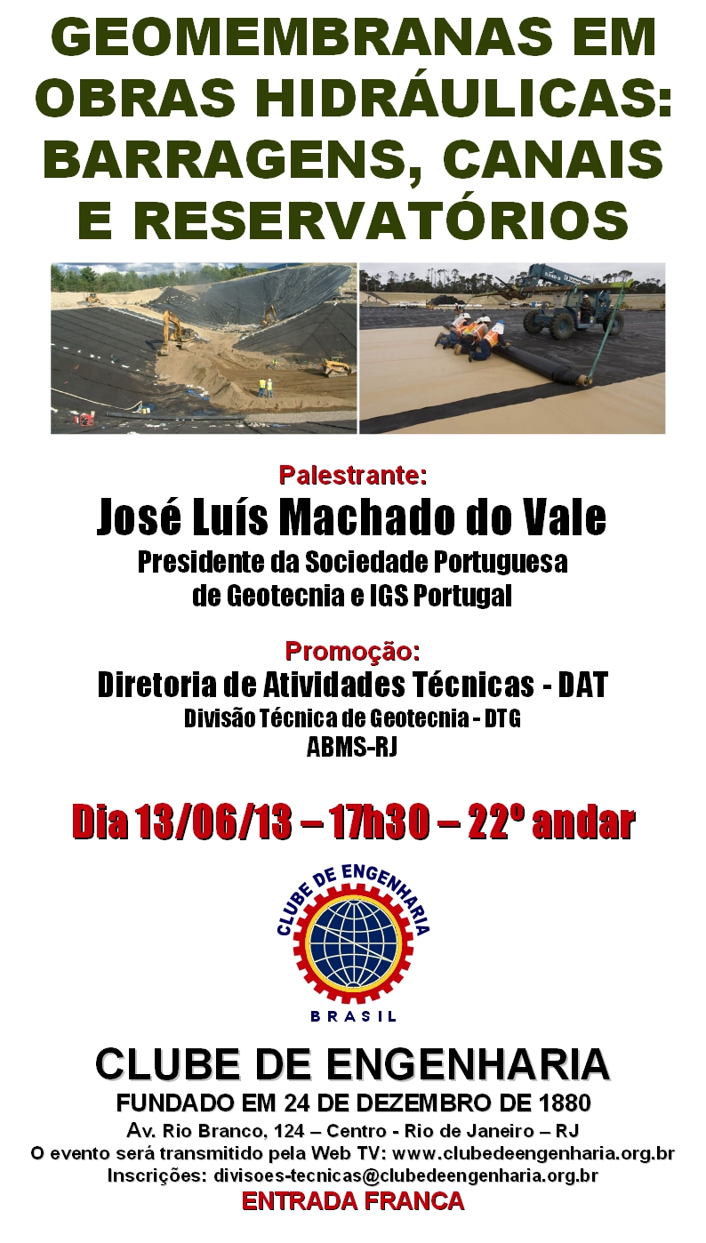 A palestra Geomembranas em Obras Hidráulicas - Barragens, Canais e Reservatórios, ministrada por José Luís Machado do Vale, presidente da SPG e da IGS Portugal, terá transmissão ao vivo pela web. O evento começa às 17h30 e, para acompanhá-lo, basta acessar www.clubedeengenharia.org.br e clicar em Web TV. Acesse aqui o folder do evento. Temas relacionados: