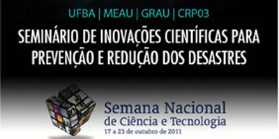 A Universidade Federal da Bahia (UFBA) organiza, entre os dias 17 e 22 de outubro, o Seminário de Inovações Científicas para prevenção e redução dos desastres. O evento acontece na Semana Nacional de Popularização da Ciência e Tecnologia, organizada pelo CNPq através do Ministério da Ciência e Tecnologia. O projeto é composto por professores e estudantes de diferentes áreas científicas e tem como objetivo criar e difundir a necessidade da redução de desastres naturais no país. Para mais informações, consulte o folder do evento.