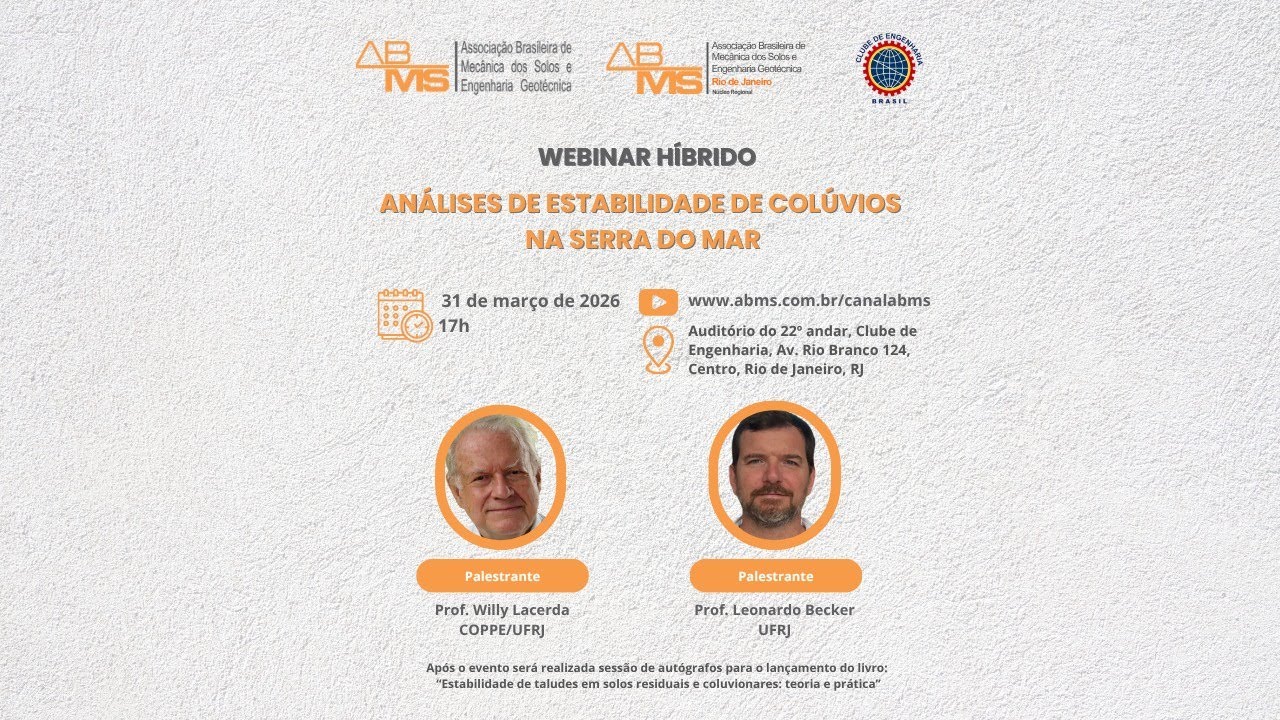 O Núcleo Regional Rio de Janeiro da ABMS realiza, no dia 31 de março de 2026, às 17h, o webinário híbrido "Análises de Estabilidade de Colúvios na Serra do Mar", em parceria com o Clube de Engenharia.